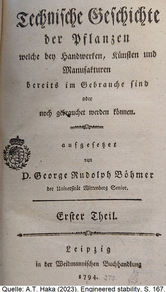 Böhmer, Georg Rudolph. 1794. Technische Geschichte der Pflanzen, welche bey Handwerken, Künsten, Manufakturen bereits im Gebrauche sind oder noch